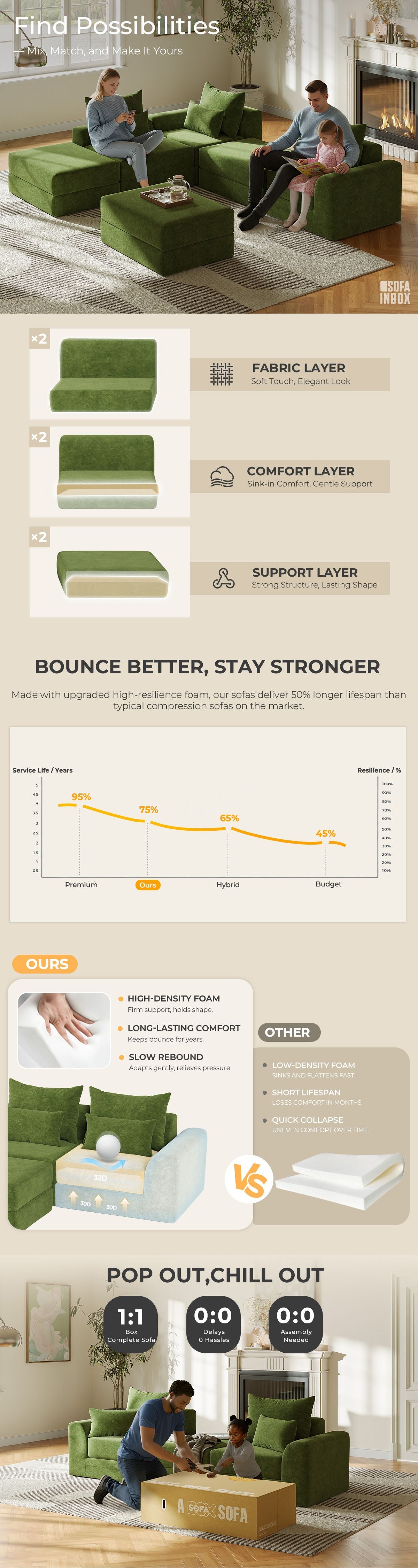 Quick Recovery & Easy Setup – Arrives in SOFA-IN-BOX compression packaging for easy delivery. Once unboxed, it can be used immediately and will fully recover its ideal shape and firmness within 24–72 hours, no tools or assembly required.